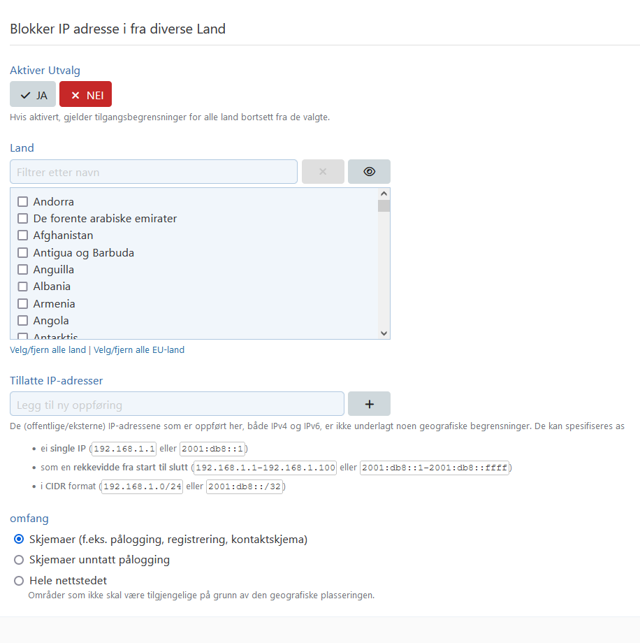 Denne utvidelsen for WoltLab Suite fra og med versjon 5.5 lar deg kontrollere tilgangen til nettsamfunnet ditt basert på opprinnelseslandet til besøkende. Med denne utvidelsen kan du nøyaktig regulere tilgangen til plattformen din: Blokkeringsliste og tillatelsesliste: Du kan inkludere visse land i en blokkeringsliste for å forhindre deres tilgang til fellesskapet ditt. Alternativt kan du opprette en godkjenningsliste som tillater tilgang eksklusivt til utvalgte land. Utgivelse av IP-adresse: Uavhengig av landstilknytning, kan spesifikke IP-adresser eller områder autoriseres til å ha ubegrenset tilgang til fellesskapet. Tilgangsbegrensninger: Du kan spesifisere om tilgangen skal være fullstendig begrenset for hele nettstedet eller kun for enkelte deler, for eksempel skjemaer for registrering, pålogging eller kontaktskjemaer. Sørg for at du er kjent med lovene angående geoblokkering i landet ditt før du bruker denne utvidelsen. Hva skjer etter kjøpet? Etter at du har kjøpt og betalt for produktet hos WoltLab, bør du registrere deg for støtteområdet i vårt støtteforum. For å gjøre dette, besøk https://activate.softcreatr.dev, hvis du ikke allerede har gjort det, fullfør registreringen og aktiver lisensen din. Etter vellykket aktivering vil du få tilgang til støtteområdet til denne utvidelsen og tilgang til «Fast Lane Service», ved hjelp av denne kan du få nye versjoner allerede før aktivering her i plugin-butikken.